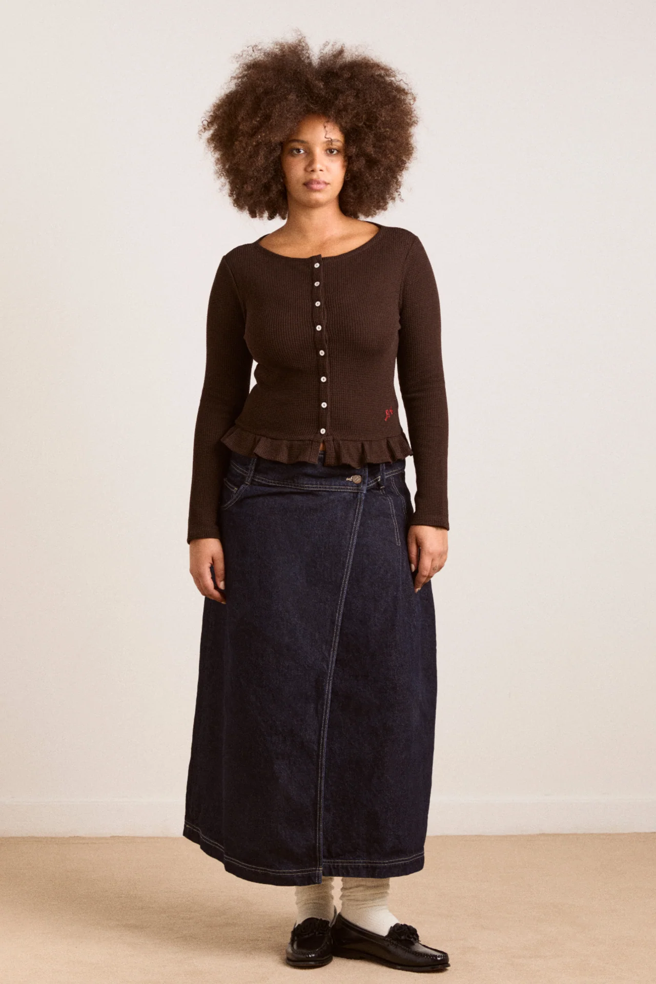 Crafted from soft, waffle fabric, this chocolate brown top is your go-to for cooler days. Designed with a flattering boat neckline and long sleeves, it’s finished with a frill hem detail that adds a feminine touch. Faux shell buttons down the front elevate the look. Made from 95% organic cotton and 5% elastane, it offers just the right amount of stretch. Thoughtfully designed in London and made in Türkiye.